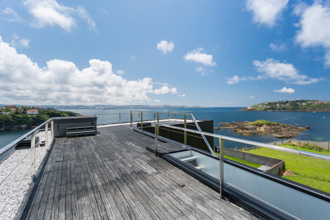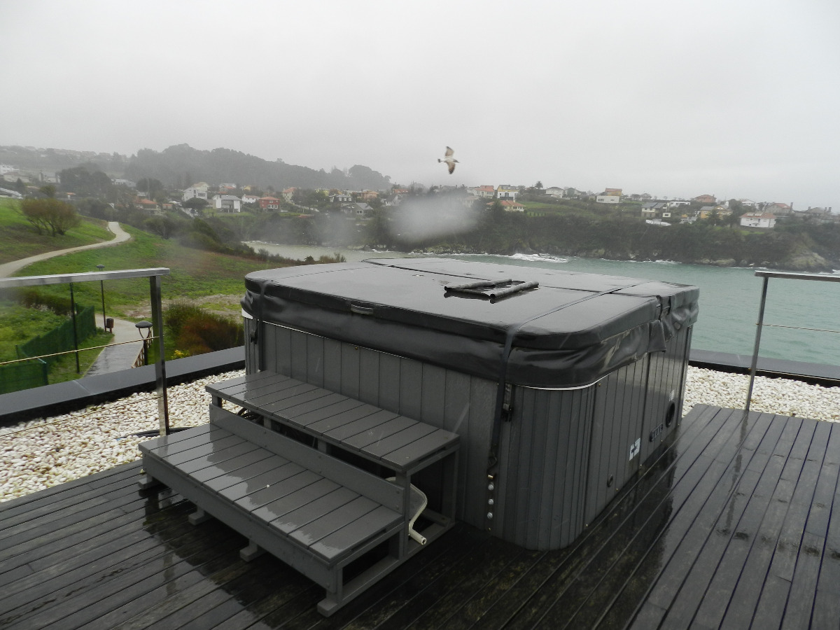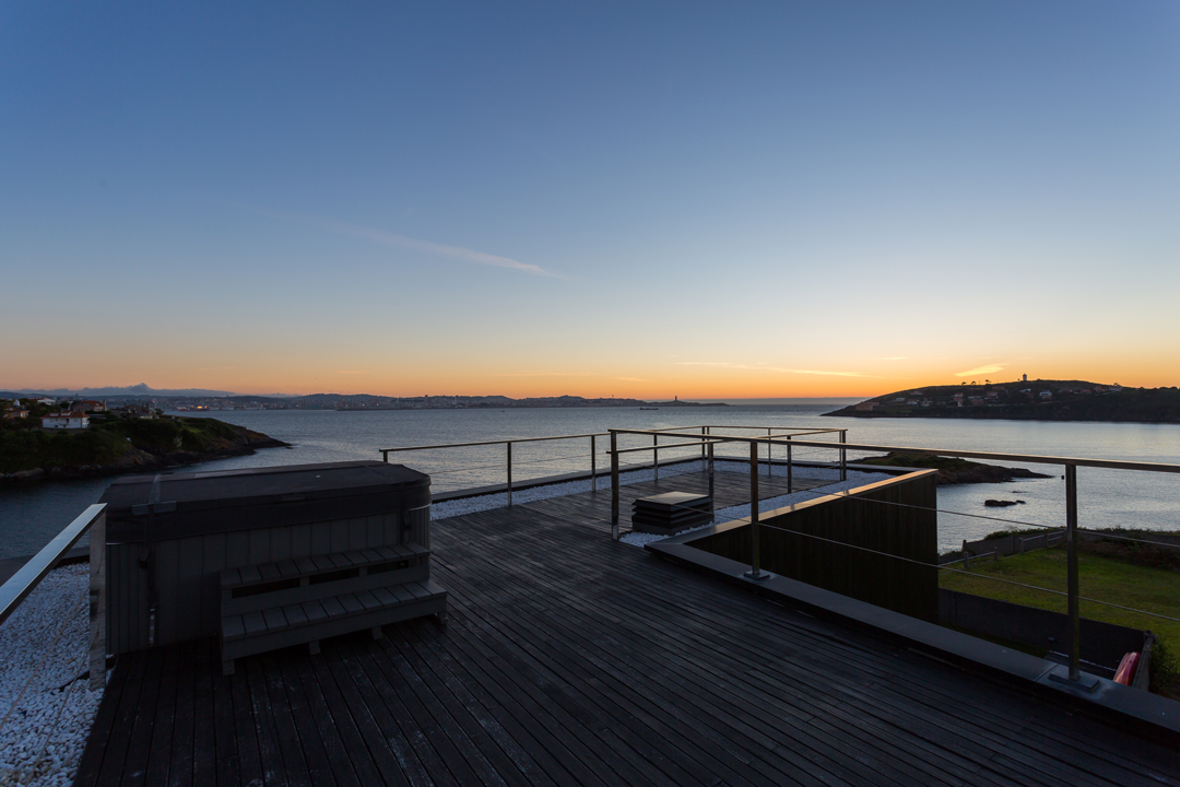 Jacuzzi en la parte alta de precisa orientacion. la terraza se convierte en porche por la disposición de toldos automáticos con mando a distancia, detector de vientos. Zona de cesped orientada al mar con riego programable. Excelentes vistas a Coruña, Canide y Mera.